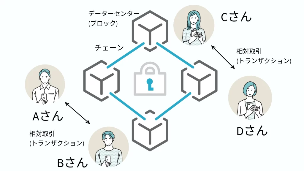 特定の管理者がいない代わりに、世界中のたくさんの人が同じ取引記録(台帳)を共有しています。誰か一人だけが勝手に記録を書き換えることができません。
